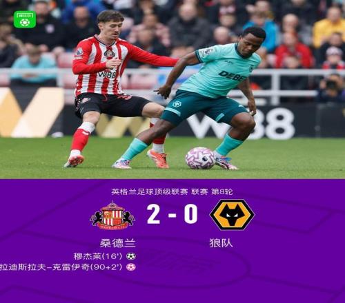 北京时间10月18日,英格兰足球超级联赛第8轮展开较量,桑德兰坐镇主场迎战狼队。比赛中,休姆送出精准助攻,穆杰莱接球后冷静施射破门,为桑德兰取得领先。下半场补时阶段,狼队球员拉迪斯拉夫-克雷伊奇不慎将球打入自家球门,进一步扩大了主队优势。最终,桑德兰以2比0战胜狼队,全取三分。